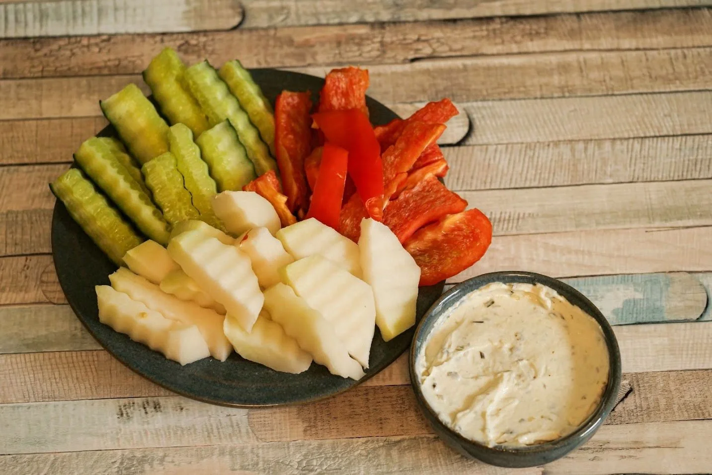 Eine weiße, ovale Platte mit pikanten Muffin-ähnlichen Snacks mit Käse und Schinken, auf einem rustikalen Holz-Tisch, gegen eine hellblaue Wand.